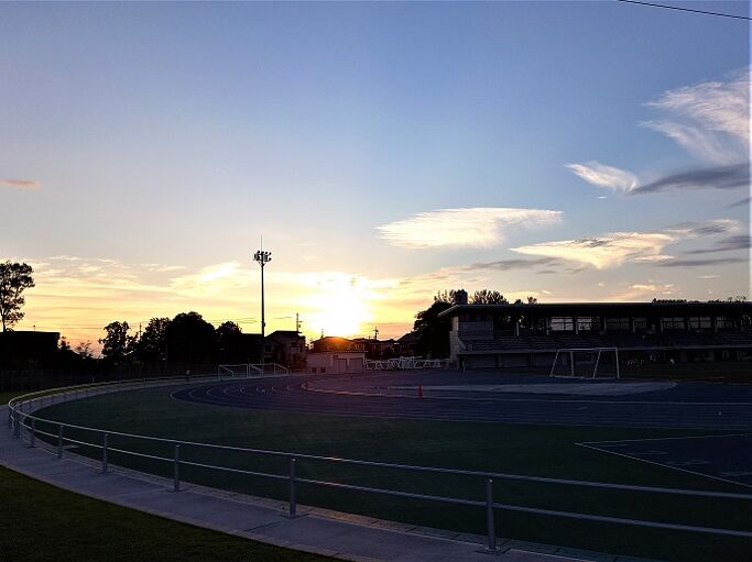 今日の夕方散歩、いつもの朝宮公園陸上競技場「スポーレ春日井」のグランド越しに夕日が沈む光景です。