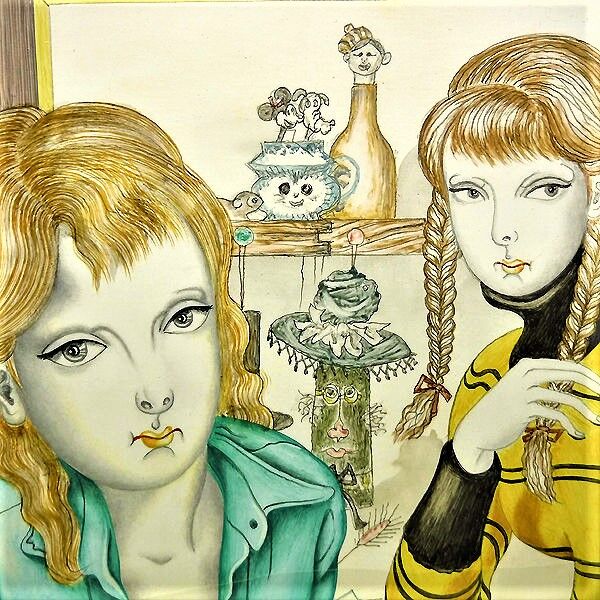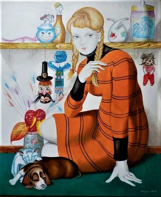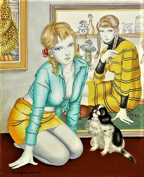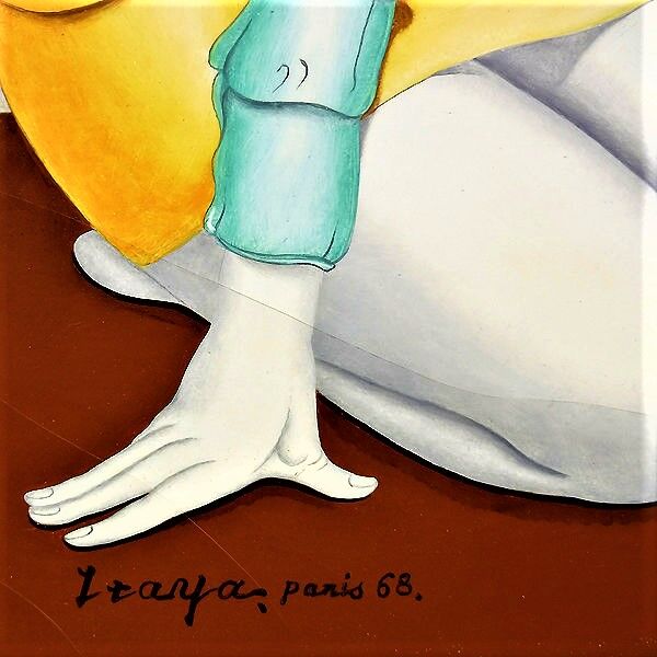1964年の『爪弾き』以降、少女・女性像が多くなり、その後、重苦しさのあった描線も色も徐々に軽やかになります。過渡期の代表作が1967年『平和のための宴』ですが、それ以降、自分のスタイルを確立した板谷は神話や物語を題材に、また源氏物語を背景に沸き上がるイメージを次々にキャンバスに描き留める作業に夢中だった様です。1968年の東京での個展で始めて生の板谷作品に接した評論家の植村鷹千代はパリでの十数年の鍛練と軽快になった色と輪郭を賞賛しこの後パリのアトリエも訪問しています。この時期、幾つかのバージョンが存在する作品が数点あり代表的なのは1968年作の『ローブの少女』と『ミニジュープの少女』でこれ以降、数作品に画中画等で見られます。『タブローの前』はこの2点を組み合わせたもので代表作2点を一度に見られる点で貴重な作品です。そして1971年8月、板谷は死にます。板谷の死と共に板谷と板谷の作品は美術史と人々の頭の中から忽然と消え失せます。