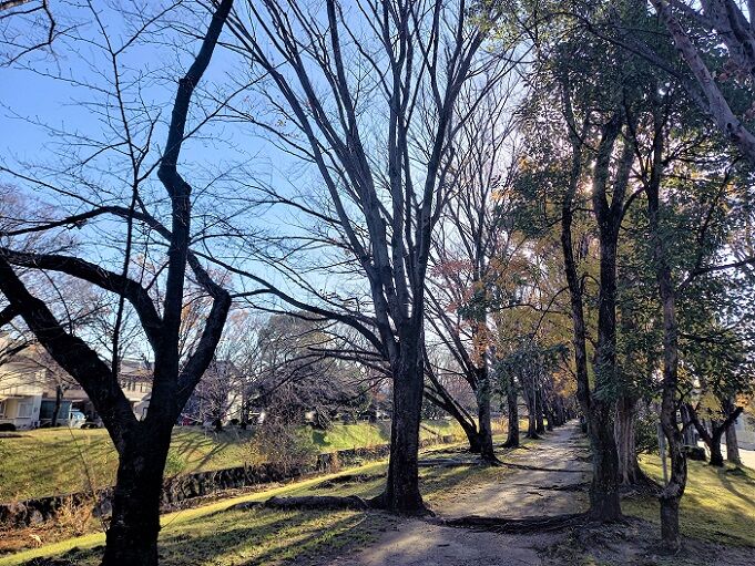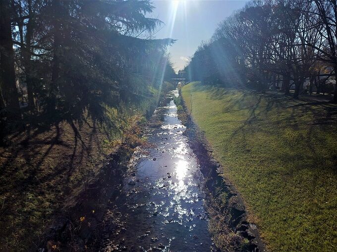 今日は雲ひとつない晴天、午後散歩は3日前に立ち寄ったパン屋さんへ行ってきました。歩いて片道約45分かかる道のりですが、ルートはいつものふれあい緑道を東に行き、途中からわき道に入ったところ。