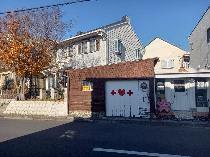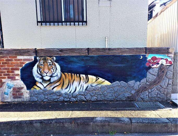 まぶしい太陽に照らされた木立が茂る歩道は快適で、道中の知らない道では新しい発見もあります。外壁に描かれた写実的なトラの絵、赤十字にハートマーク?こうした発見は楽しいですね。