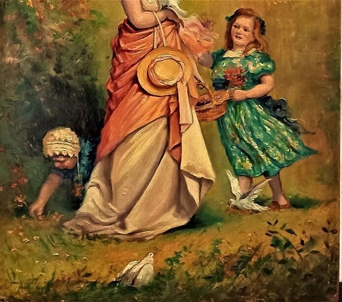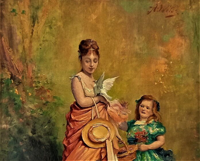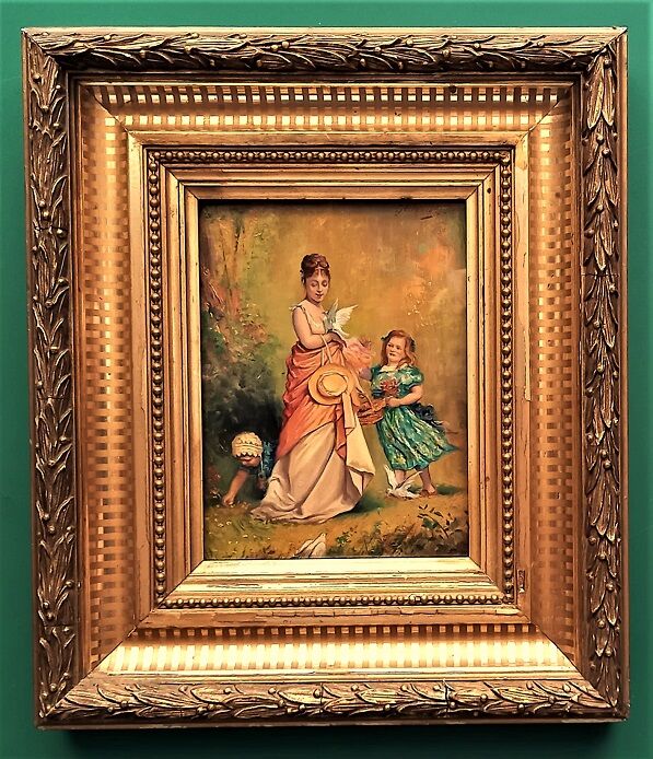 絵の右上にサインはあるが、有名なのかどうかは不明、21.7cm×16cmの小品ですが、写実的に描かれた19世紀頃の作品ではないかと見込んでいます。額縁の造形は有名美術館の古典絵画が納まったデザインと同じなのがこの絵の価値に魅力を感じさせます。