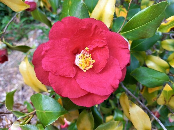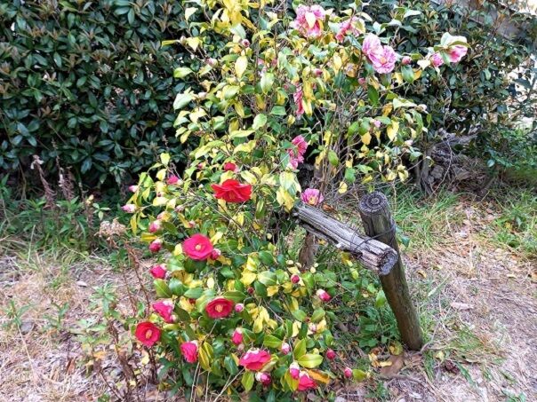 あれあれ、綺麗に咲いた2種類の椿。支え棒は朽ちて今にも折れそう、栄養不足の為か、葉が黄ばんでいます。でも風当たりが弱い環境なので花弁が痛まず、綺麗すぎるほど綺麗です。
