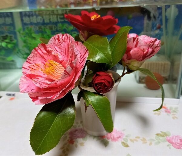 ここ数週間、散策で他人のお屋敷や公園で見かけた椿を撮影してきましたが、それよりもずーと綺麗なので、少し切って花瓶に生けてみました。